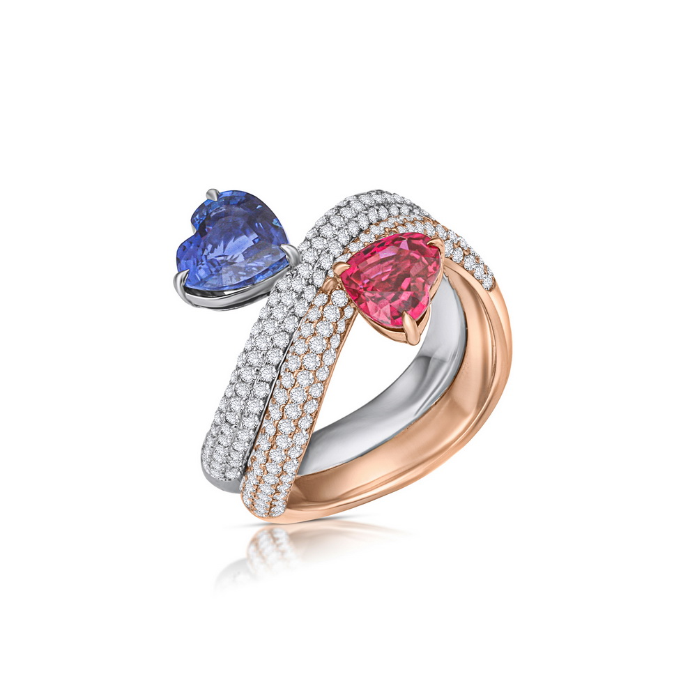 טבעת זהב לבן ואדום משובצת יהלומים בשילוב ספיר ורובי